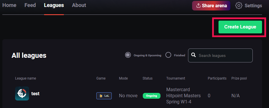 You can also access this by going to Leagues in the Navigation bar. This will list all your current Leagues; press the green "Create League" button to enter the League creation window.