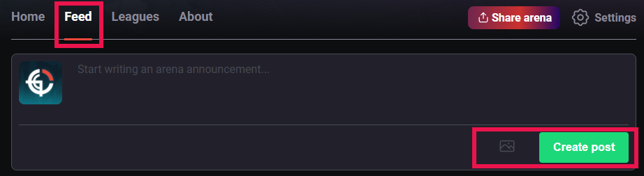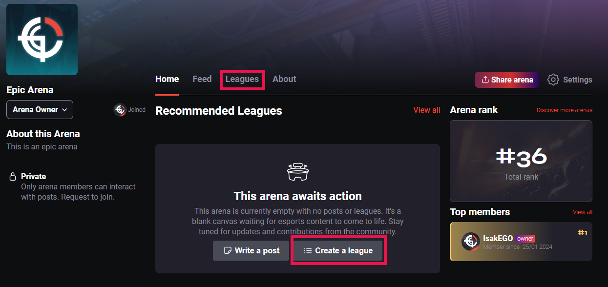 If you do not have any content uploaded to your Arena, it will prompt you to create a Post or a Fantasy League. By pressing Create a League, you will enter the League creation window.